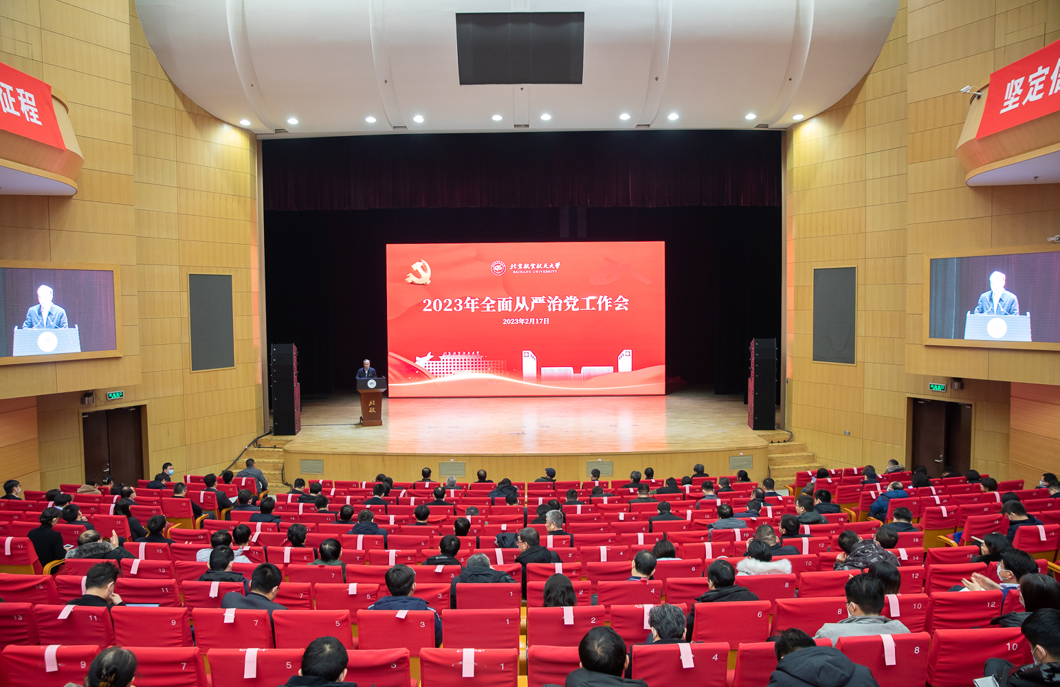 赵长禄指出,2023年是全面贯彻落实党的二十大精神的开局之年,也是学校召开第十七次党代会、谋篇布局之年,做好学校全面从严治党工作意义十分重大。要认真落实党中央和上级部署要求,把严的基调、严的措施、严的氛围长期坚持下去,一刻不停推进全面从严治党。一是牢牢把握全面贯彻落实党的二十大精神这条主线。要在全面学习、全面把握、全面落实上下更大功夫,引导广大干部师生坚定拥护“两个确立”、做到“两个维护”。二是不断完善党的领导的组织体系、制度体系、工作机制。要坚持和完善党委领导下的校长负责制,健全党委统一领导、党政分工合作、协调运行的工作机制,深化中央巡视整改,贯彻总体国家安全观,压紧压实意识形态工作责任,加强党对统战群团工作的全面领导。三是坚持不懈用习近平新时代中国特色社会主义思想凝心铸魂。要完善校、院、师生三级理论学习体系,健全用党的创新理论武装头脑、教育师生的长效工作机制。要进一步完善“大思政”工作格局,讲好疫情防控“大思政课”,加强学生心理健康教育。要把师德师风建设作为教师队伍建设的第一要务,建设高素质教师队伍。要传承红色基因,弘扬以“空天报国”为内核的北航精神,营造崇尚立德树人成效、崇尚学术成就的浓郁氛围,孕育一流大学气质。四是深入落实新时代党的组织路线。要深化“全国党建工作示范高校”建设,增强基层党组织政治功能和组织功能。要坚持把政治标准摆在首位,完善选人用人机制。要分层分类抓好干部教育培训,提升政治能力、业务能力、行政能力,增强斗争精神。要坚持党管人才,深入实施人才强校战略,激发各类人才活力。五是推进作风建设常态化长效化。要严格落实中央八项规定精神。要坚持以人民为中心的发展思想,加快建好学生中心、教师发展中心等服务支撑机构,着力改进机关工作作风。六是严格规范监督执纪问责。要把纪律建设摆在更加突出位置,增强每一名党员的纪律意识、规矩意识。要健全党内监督为主导、各类监督贯通协调的工作格局。要推进政治监督具体化、精准化、常态化。要深化中管高校纪检监察体制改革,提升执纪问责的规范化、法治化、正规化水平。七是以高质量党建引领高质量发展。要坚持为党育人、为国育才,强化一流的教育教学资源供给,推动科研优势转化为人才培养优势。要推动教育、科技、人才深度融合,推进学科、平台、团队一体化发展。要全面深化综合改革,加强制度建设,完善治理体系,提升治理能力。