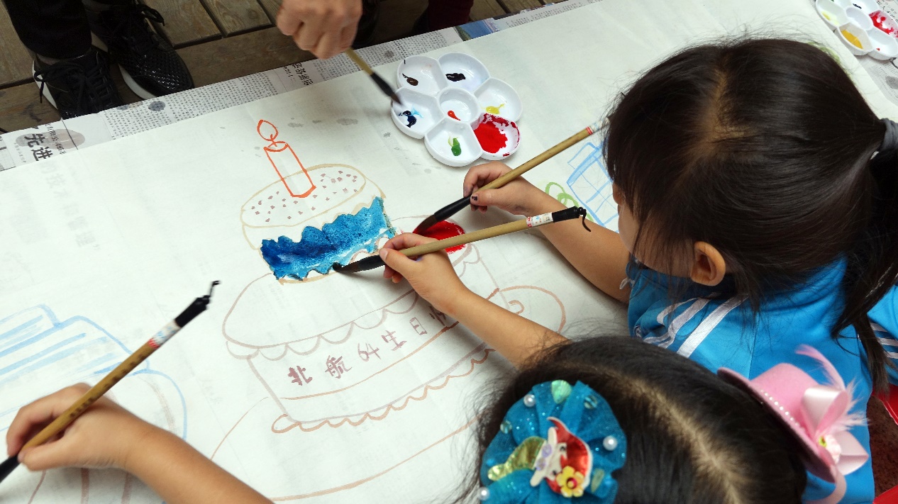 本次活动结合园方目前的课程进度,确定了关于牙齿保护主题的绘本学习与创作。活动的开始,支部成员为附属幼儿园的小朋友们讲解了牙齿保护的重要性,回顾了绘本《可爱的身体——谁是蛀牙的朋友》,用绘本通俗易懂的展示了牙齿健康的相关知识和保护牙齿的措施。随后,联合党支部成员给小朋友们分发了可供填充的牙齿造型,并重点讲解了“色粉”这一小朋友们首次接触的特殊绘画材料,利用它可以在纸上二次混合的特性,指导小朋友们完成绘画创作。在课程讲授及现场创作的过程中,孩子们很乐意参与到绘画实践中,纷纷创作出了独一无二、丰富多彩的绘画作品。在和孩子们互动的过程中,联合党支部的成员们体会到了美术教育的启发性思维对孩子们的创作具有指导性作用。最后孩子们一起绘制了一幅为北航六十四周年校庆献礼的水墨长卷,全体老师孩子与学生党员在长卷前进行了合影留念。
