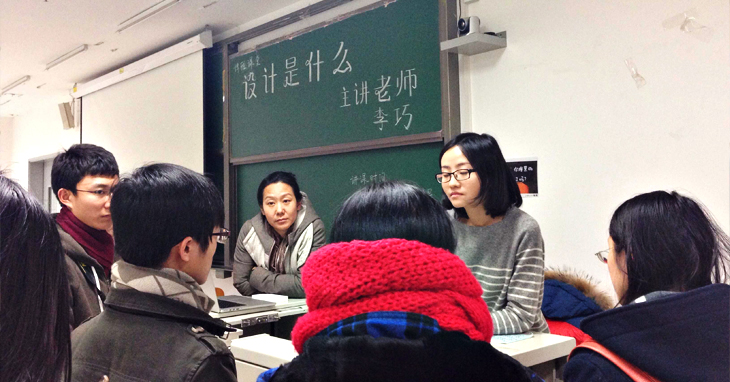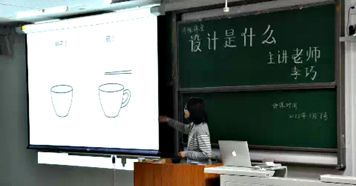 李巧老师首先由"杯子和碗的认识"来引出本次课堂的主题,告诉我们设计不能用僵化死板的思维,想当然的随便瞎画,而是要将已知的事物陌生化,然后去真正地认识它。然后通过观看广告短片的形式向学生简单介绍GAP、优衣库、无印良品三家国际服装品牌公司的发展历史和设计理念。GAP是一个全世界最知名也最具影响力的大众休闲装品牌,它是一个代表着同样休闲简约文化的大型服装集团。他们的宗旨是让顾客更容易地找到满意的牛仔裤及创造易于选购产品的店铺体验。优衣库(Uniqlo) 的内在涵义是指通过摒弃了不必要装潢装饰的仓库型店铺,采用超市型的自助购物方式,以合理可信的价格提供顾客希望的商品。UNIQLO优衣库首席艺术总监、日本知名设计师佐藤可士和提出了"超整理术"的概念,这也是让优衣库如此成功的原因。无印良品是一个日本杂货品牌,在日文中意为无品牌标志的好产品。产品类别以日常用品为主。产品注重纯朴、简洁、环保、以人为本等理念,在包装与产品设计上皆无品牌标志。与其说这些商品是一个品牌,不如说它是一种生活的哲学。它不强调所谓的流行,而是以平实的价格将还原了商品价值的真实意义,并在似有若无的设计中,将产品升华至文化层面。接着李巧老师通过与学生们共同分享她的两个工作经验让学生们了解设计的过程,最后具体阐述了一个好的设计的完成过程。首先根据策划或意念去寻找所需要的素材,然后把这些素材形成逻辑,之后构建框架或画出草图,最后形成视觉语言。而这些步骤不是独立完成的,看一个步骤是否完成是在下一个步骤的进行中才能确定的。
