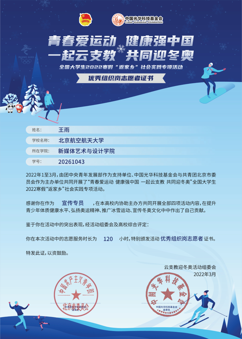 心怀热忱,燃情志愿。连续两学期参加支教队,获北航社会实践一等奖及《岳阳晚报》、新浪网等主流媒体报道;支教期间拍摄剪辑中阳剪纸纪录片《一纸匠心,手吐霓虹》,助力非遗活态传播;参加共青团中央“云支教迎冬奥”活动,获“优秀组织岗志愿者”。