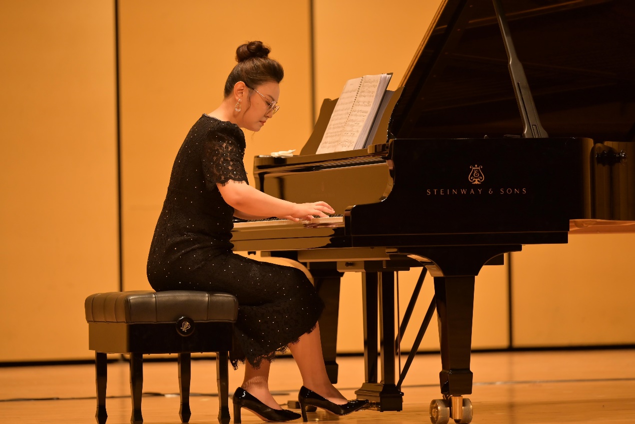 北航美育中心党支部书记、副教授石慧,弹奏了自己改编的泽昆哈·阿布鲁作曲的《雀鸟》、郑秋枫作曲的《我爱你,中国》。