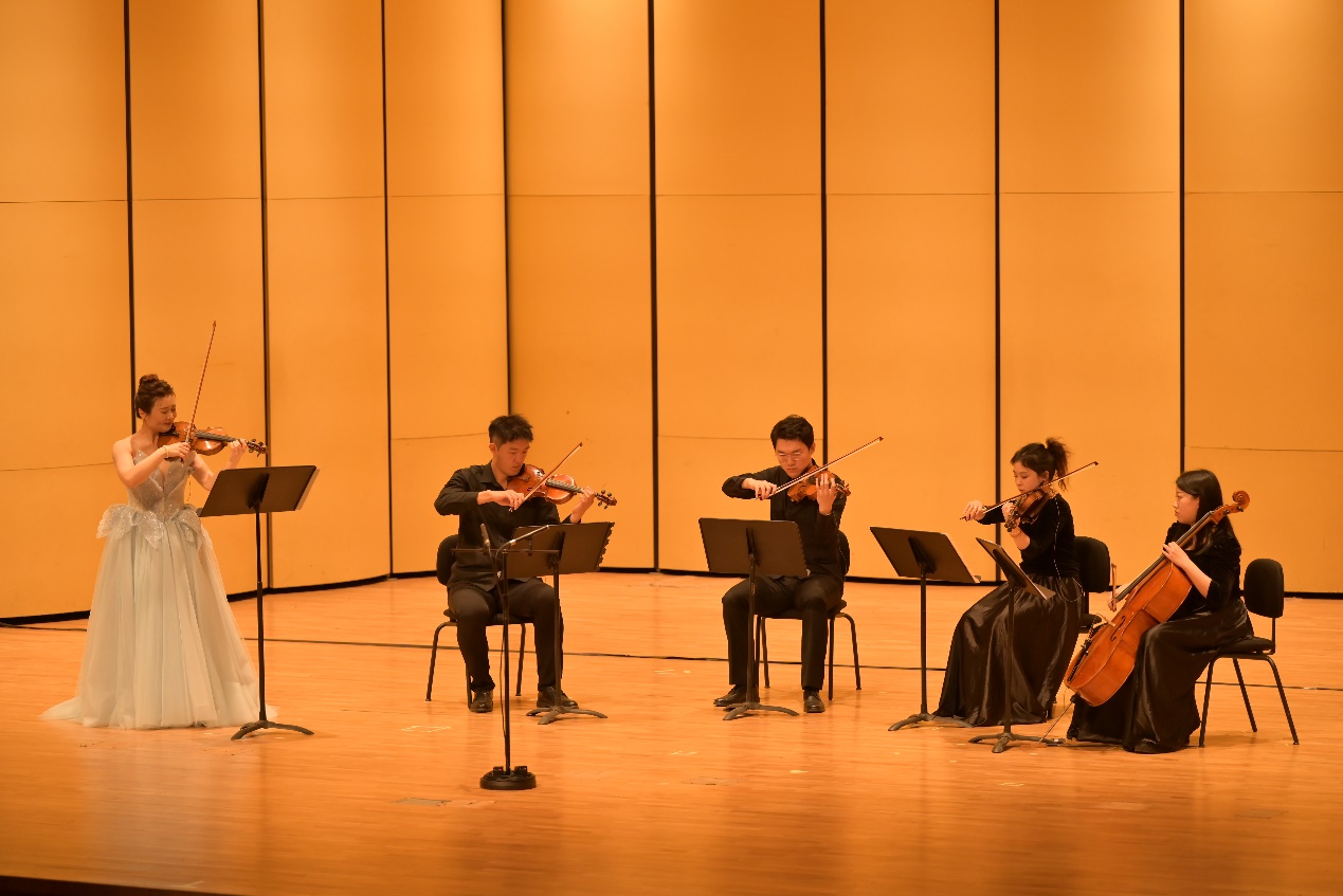 音乐会节目精彩纷呈,北航美育中心副教授张聪,携北航团委学生交响乐团刘楚轩、孙开新、赵哲、高圣昕四位同学组成的“福新高赵”四重奏演奏的维瓦尔第《四季》之《夏》开场。