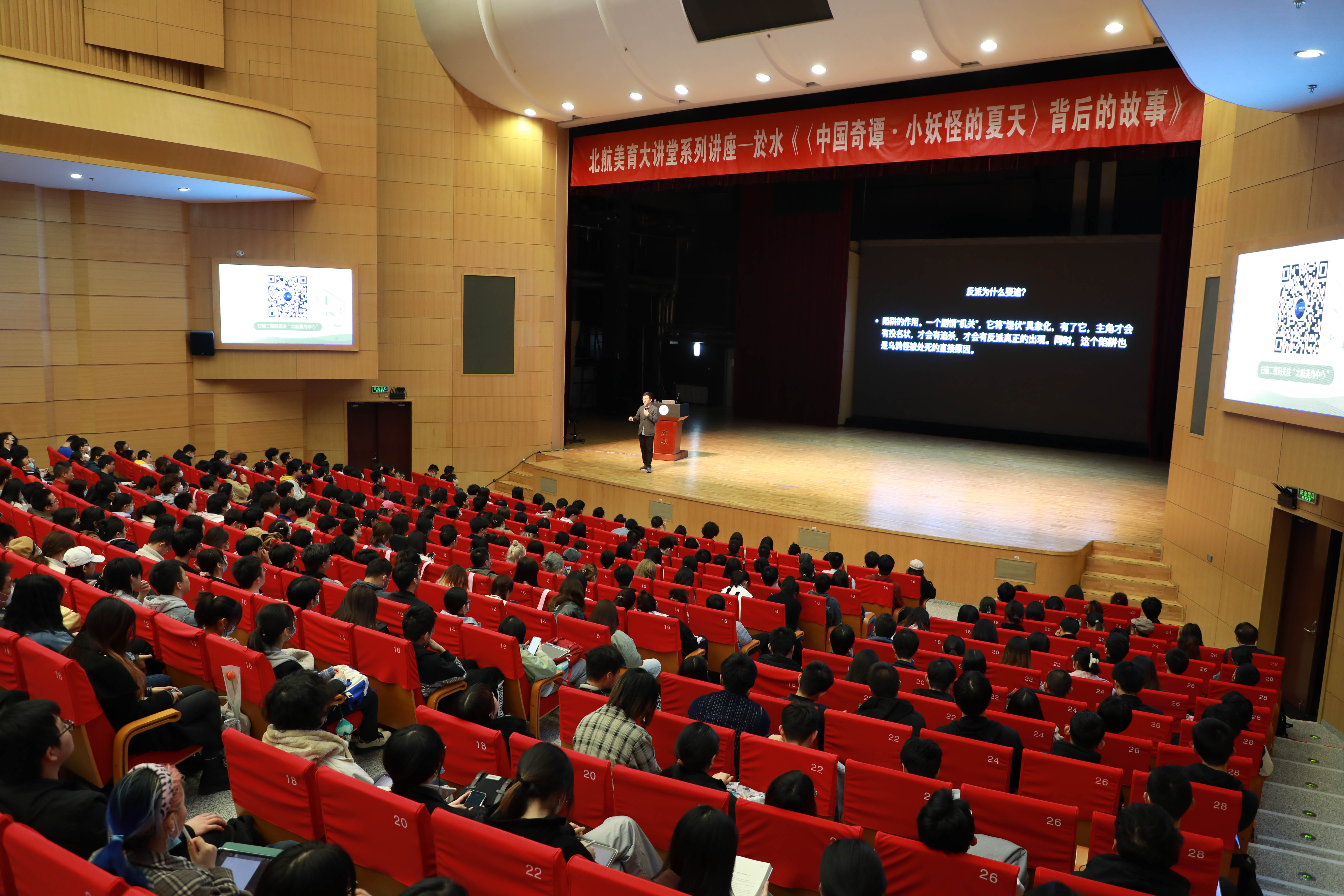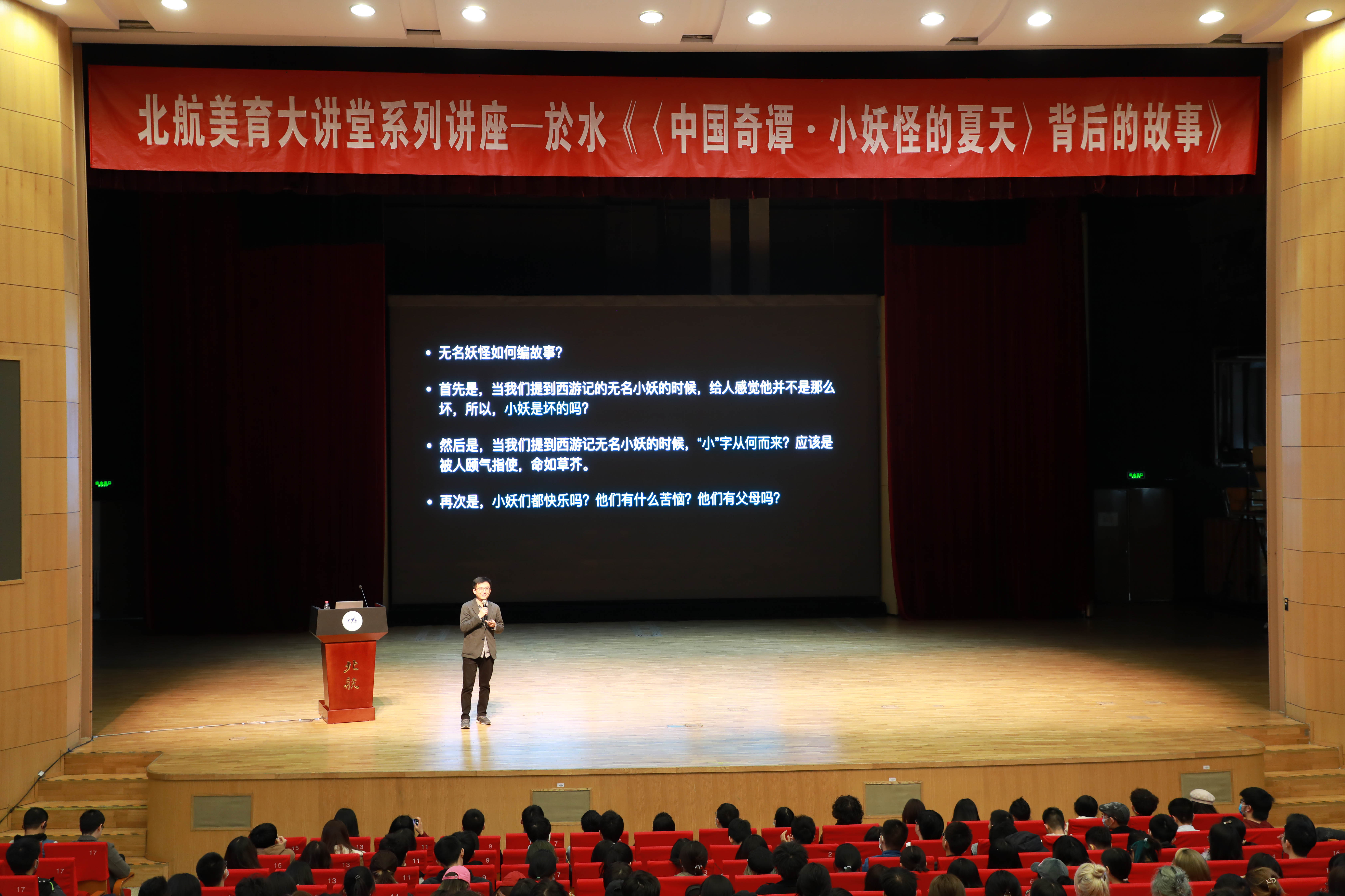 3月8日、3月15日下午,北航美育中心特邀偷拍在线 副教授於水分别在学院路校区晨兴音乐厅和沙河校区咏曼剧场,为北航师生讲述《〈中国奇谭·小妖怪的夏天〉背后的故事》美育主题报告。全校师生1200余人在现场聆听,两场讲座均座无虚席。讲座由美育中心副主任臧小戈主持。