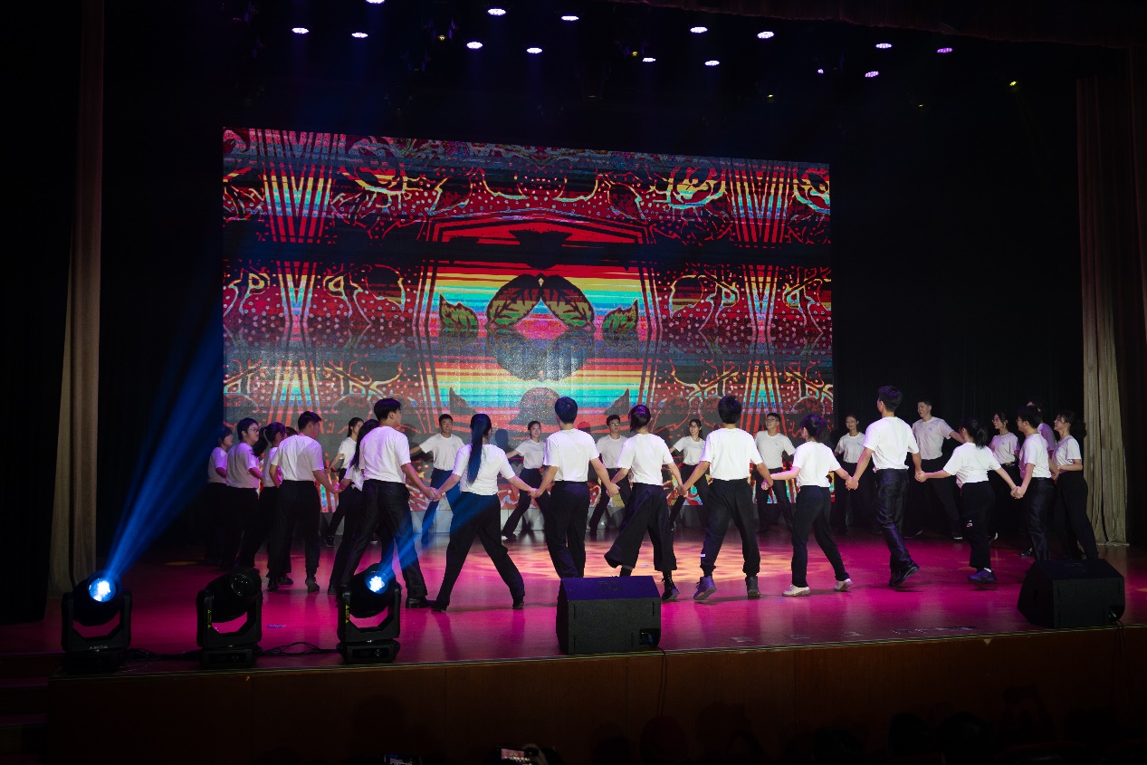 本次美育课程联合汇报展演的影像和美术设计分别由邹玲老师的课程《几何造型与数字舞台表演》、张弛老师的课程《海报创意与制作》承担制作。现场近500名观众观看了演出。