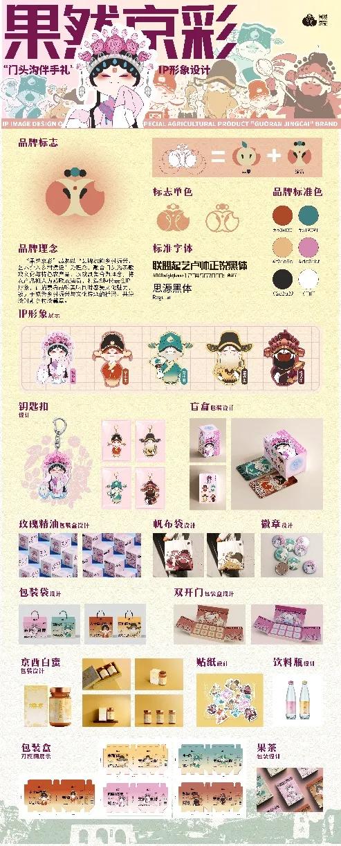 门头沟区有着优质的农产品与优秀的传统文化。我们小组对这二者进行结合,以“品牌设计赋能乡村振兴、艺术介入乡村建设”作为设计理念,将门头沟区的独特非物质文化遗产“燕歌戏”融入设计中,以生旦净末丑为形象原型,为妙峰山玫瑰、太子墓苹果、京白梨、京西白蜜、妙峰山樱桃这五种农产品,打造了“果然京彩”这一农产品品牌,设计了五个独特的IP形象。