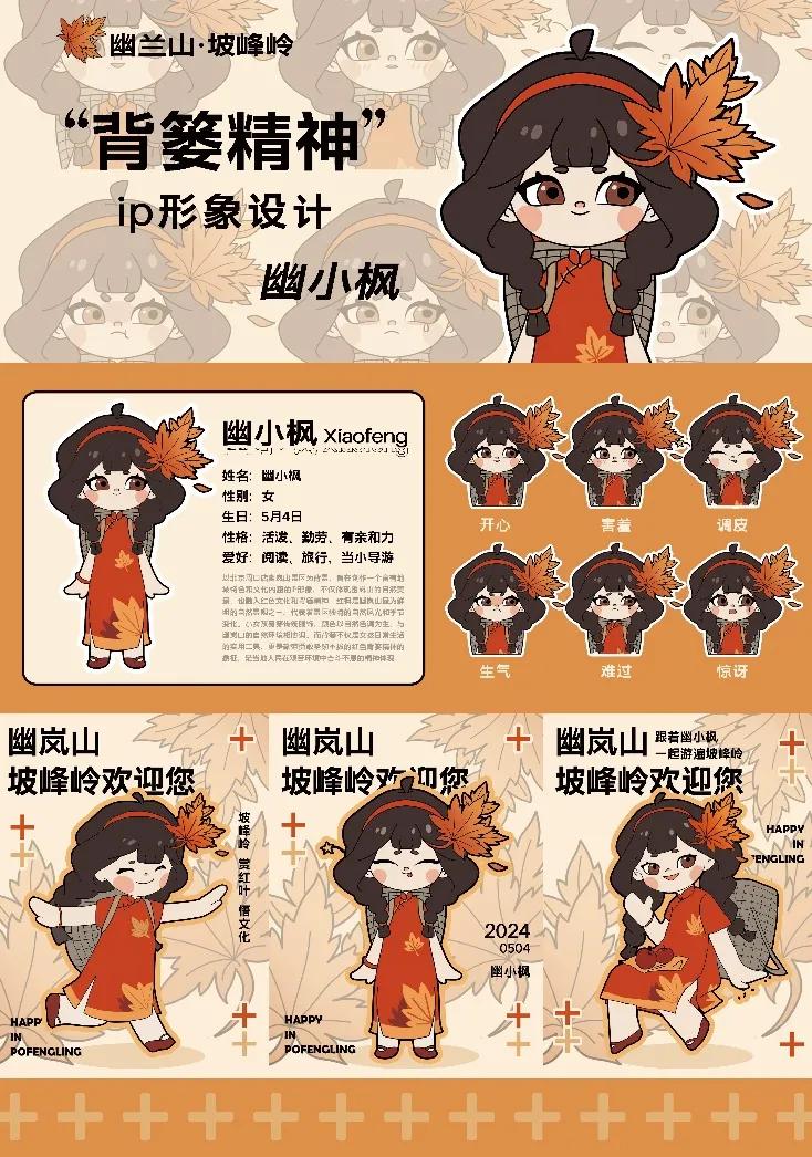 在数字化媒体时代,红色文化“背篓精神”的IP设计还具有巨大的网络传播潜力。我们以北京周口店幽岚山景区为创作背景,进行IP形象设计,充分的表达出幽岗山的风土人情和文化底蕴。红枫是幽岚山最为鲜明的自然景观之一,代表着景区独特的自然风光和季节变化;而背篓不仅是女孩日常生活的实用工具,也是勤劳勇敢坚韧不拔的红色背篓精神的象征。