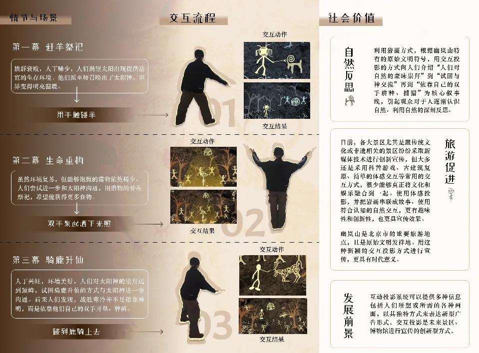 形成岩画互动影像。影像作品共三个场景:“赶羊祭祀”、“重构生命”、“骑鹿升仙”。故事从人们对自然的蒙昧认识开始,对自然神明充满崇拜,直到自力更生用自己的双手创造美好生活,改造自然。通过体感交互,让热爱探险的登山者在岩画世界中,了解我们是如何一步步与自然产生联系,如何经历从认识自然,崇拜自然到改造自然的过程。“穿越幽岚秘境,解码岩画传奇,和原始人一起揭开自然演进的神秘面纱!”