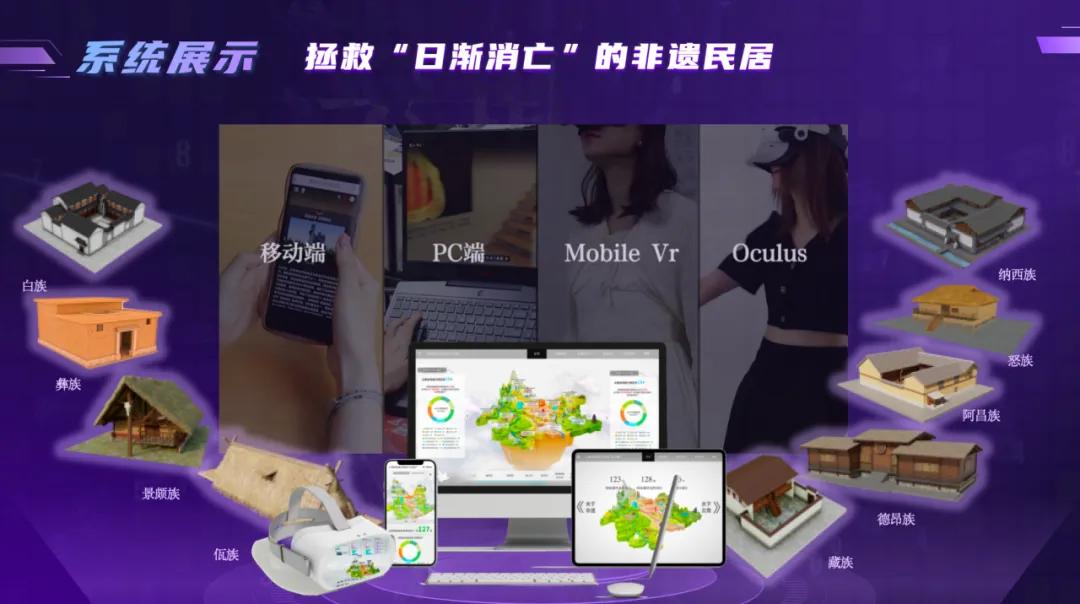 平台包含翁丁佤寨数字化体验系统、云南省线上民居博物馆、非遗舞蹈创意编排与展示系统等多项内容,利用设计思维与实践,重塑了“一把大火”后的翁丁佤寨、守护了“日渐消亡”的非遗民居、接棒传承人“盘活”了活态化非遗。