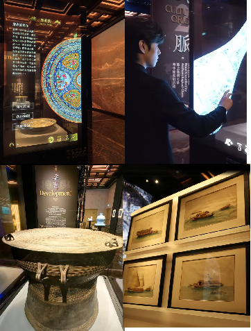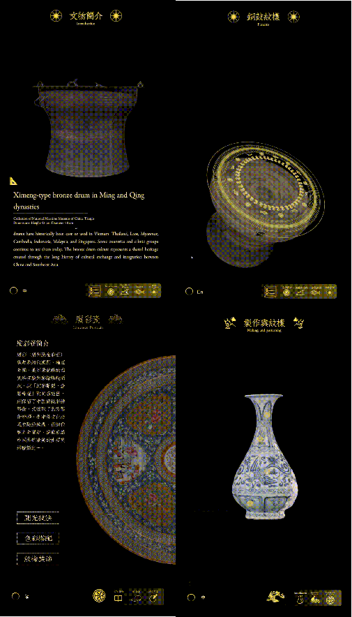 保利美高梅博物馆首展以蓝色飘带——探索神秘海域 邂逅丝路遗珍为名,以海上丝绸之路为主题,以海洋考古为线索,带领世界各地的观众一起探索海上丝绸之路的过去、当下和未来。北航设计团队依托“时间典藏®多功能文保全息展柜”所展示的四件珍贵文物,分别是:元青花凤穿花卉纹玉壶春瓶、清广彩开光阿拉伯文人物花卉纹盘、清龙船图通草画、明清西盟型铜鼓。通过尖端科技手段,让文物与数字内容实现了无缝对接,让文物“可触摸”、“动起来”、“能说话”。
