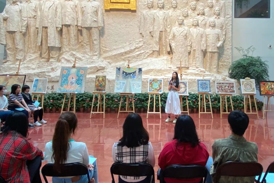 紧接着,杨紫絮、左政轩、张贺、秦尔仪同学分别分享了他们在创作民间绘画作品时的思路与体会。四位同学在创作中将传统敦煌元素与现代航空航天主题相结合,他们通过深入研究和巧妙运用AIGC技术,找到了富有自身特点的方案。杨紫絮同学选择克孜尔壁画为底表现航天发展历史,左政轩同学借鉴敦煌妆容特点表达“飞天”主题,张贺同学将航天器结合应龙纹与玉器纹路,秦尔仪同学则将火箭与传统火焰纹样相融合。